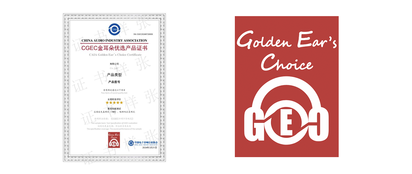 CGEC(CAIA Golden Ear’s Choice)金耳朵选择是中国电子音响行业协会推出的我国电声行业首个针对音频产品,综合客观检测与主观评价的权威性证书,是相关企业提升产品音质的重要参考依据。该认证适用于音响 / 音箱类、有线耳机类、无线耳机类、音源 / 功率放大器类、电视机类产品。